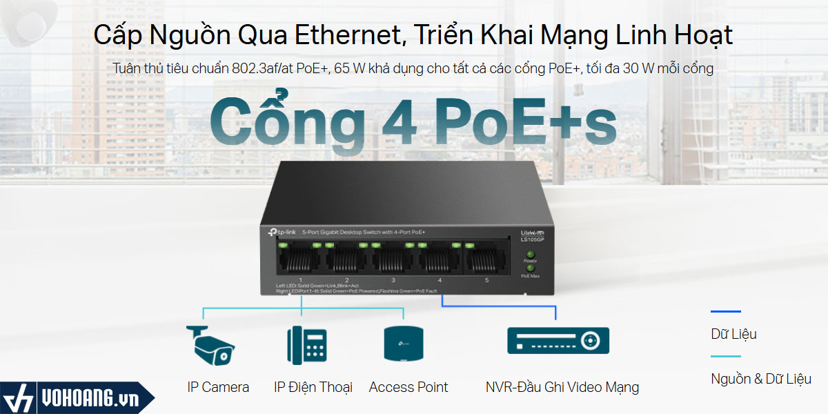 LS105GP là cung cấp năm cổng gigabit với khả năng chuyển mạch lên đến 10 Gbps, đáp ứng nhu cầu truyền dữ liệu tốc độ cao. Điểm nổi bật là bốn cổng PoE+ gigabit 802.3af/at tương thích, cho phép kết nối và cấp nguồn cho các thiết bị cố định như camera IP, điểm truy cập và điện thoại IP thông qua một cáp duy nhất.