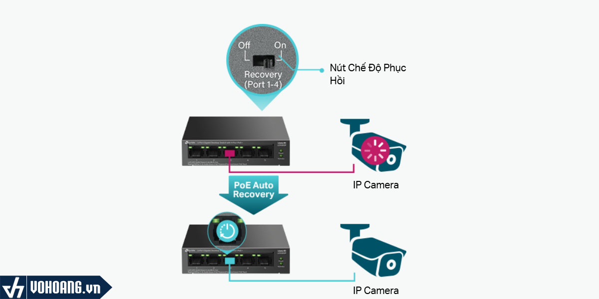 Ngoài ra, tính năng PoE Tự Động Phục Hồi giúp tự động khởi động lại các thiết bị hỗ trợ PoE bị ngắt kết nối hoặc không phản hồi, đảm bảo sự liên tục và ổn định cho hệ thống mạng.