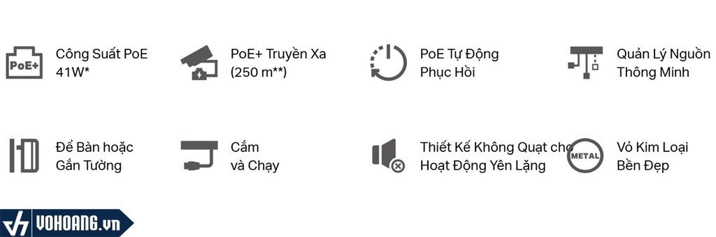 Tuân thủ các tiêu chuẩn IEEE 802.3af/at PoE, switch hỗ trợ tổng công suất PoE là 41 W và tối đa 30 W trên mỗi cổng PoE+. Khi tổng mức tiêu thụ điện năng vượt quá 41 W, tính năng quản lý nguồn điện thông minh sẽ cắt nguồn điện của các cổng có mức ưu tiên thấp hơn để bảo vệ thiết bị khỏi bị hư hỏng.