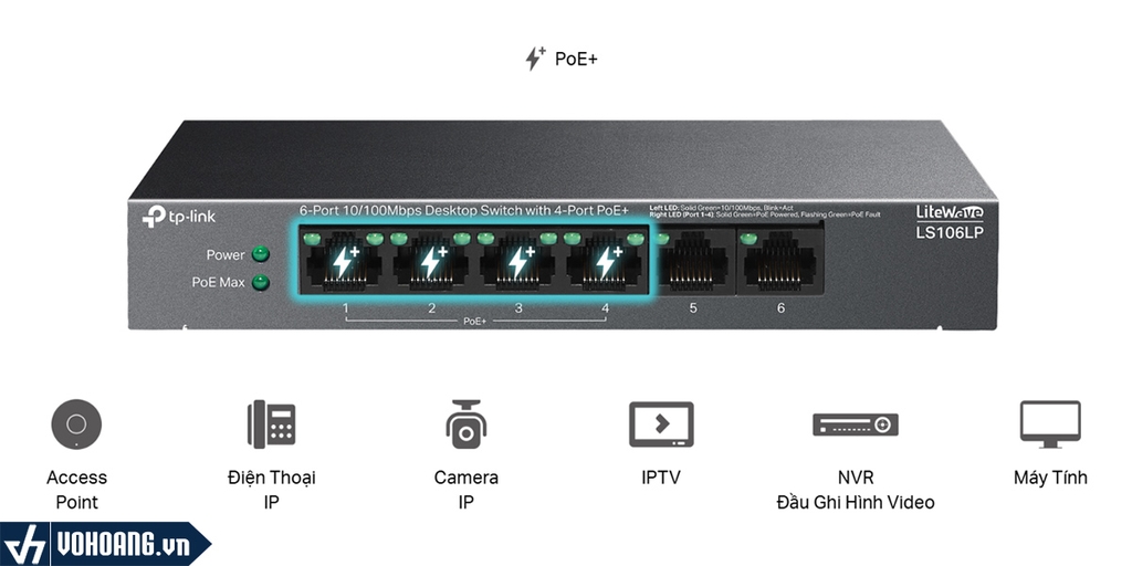 LS106LP - Switch Poe Litewave tốc độ 10/100Mbps tiết kiệm năng lượng giải pháp cho hệ thống camera gia đình với khoảng cách truyền tải ngắn, công suất tổng đạt 41W đảm bảo hoạt động tốt cho 4 camera khoảng cách 10-20m. LS106LP hỗ trợ thêm 1 cổng RJ45 giúp mở rộng hệ thống mạng đơn cử như là cấp mạng cho đầu ghi hình NVR.