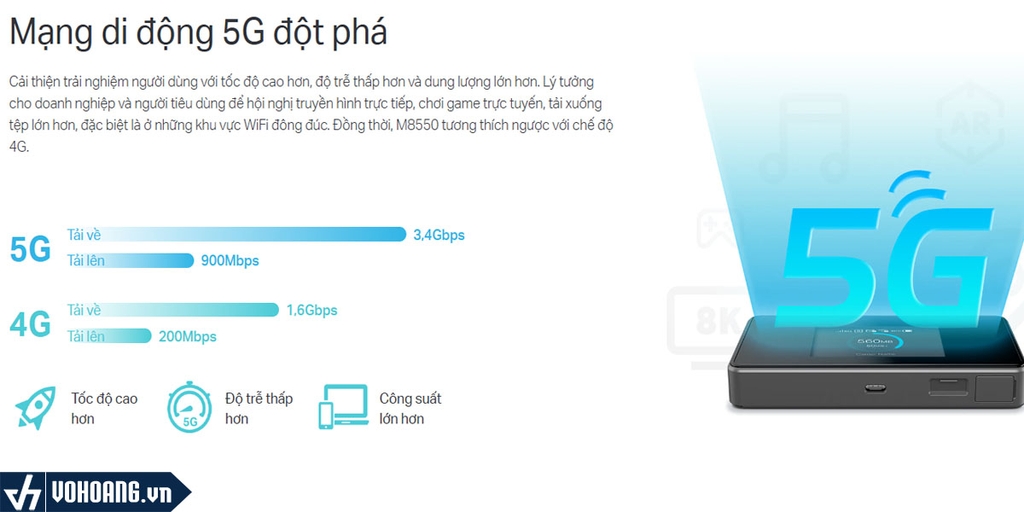 Cải thiện trải nghiệm người dùng với tốc độ cao hơn, độ trễ thấp hơn và dung lượng lớn hơn. Lý tưởng cho doanh nghiệp và người tiêu dùng để hội nghị truyền hình trực tiếp, chơi game trực tuyến, tải xuống tệp lớn hơn, đặc biệt là ở những khu vực WiFi đông đúc. Đồng thời, M8550 tương thích ngược với chế độ 4G.