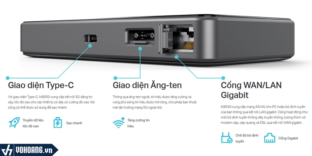 Giao diện Type-C - Với giao diện Type-C, M8550 cung cấp kết nối 5G đáng tin cậy, tốc độ cao cho các thiết bị có dây có cường độ cao. Nó cũng có thể được sử dụng để sạc nhanh.