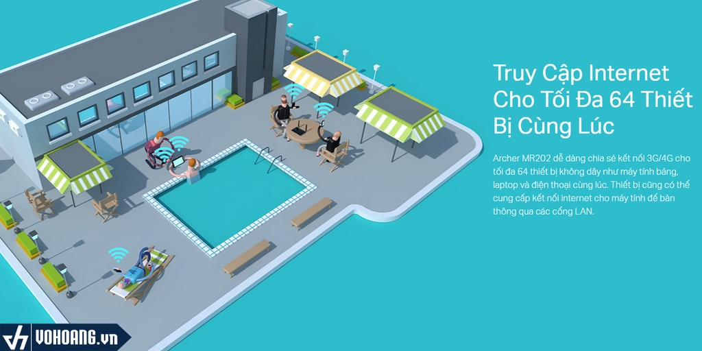 - Archer MR202 dễ dàng chia sẻ kết nối 3G/4G cho nhiều thiết bị Wi-Fi như máy tính bảng, laptops và điện thoại di động cùng lúc. Thiết bị cũng có thể cung cấp truy cập internet cho máy bàn thông qua các cổng LAN.