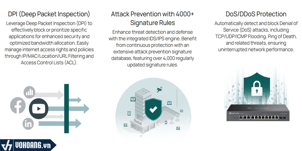 DPI (Kiểm tra gói tin sâu): Tận dụng Kiểm tra Gói Sâu (DPI) để chặn hoặc ưu tiên hiệu quả các ứng dụng cụ thể nhằm tăng cường bảo mật và tối ưu hóa phân bổ băng thông. Dễ dàng quản lý quyền truy cập internet và chính sách thông qua Lọc IP/MAC/Vị trí/URL và Danh sách Kiểm soát Truy cập (ACL).