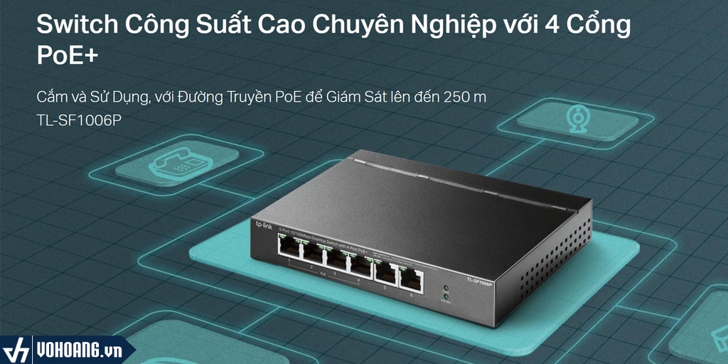 Tp-Link SF1006P là giải pháp hỗ trợ cấp nguồn và mạng internet cho các thiết bị camera giám sát, thiết bị wifi ốp tường dùng gia đình hoặc hộ kinh doanh với 4 cổng PoE, 2 cổng Uplink 10/100Mbps. Với việc có khả năng cấp nguồn và mạng lên đến 100m cho phép bạn thoải mái trong việc sắp sếp vị trí thiết bị theo ý thích.