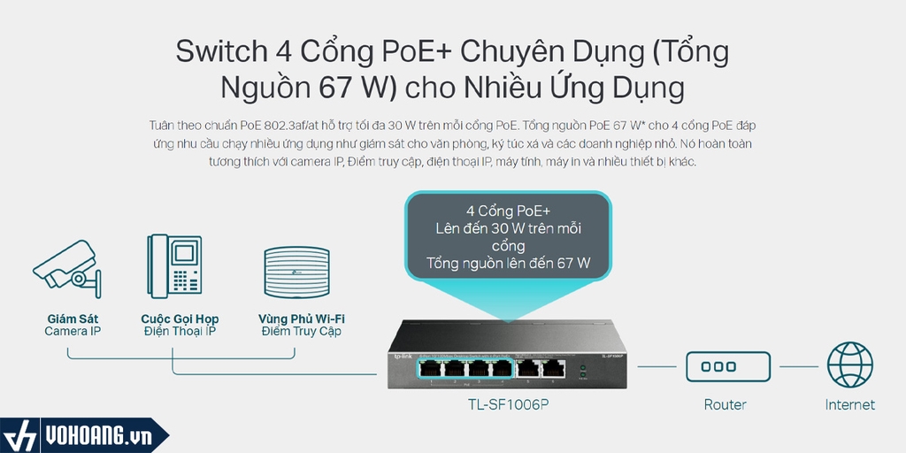 Tuân theo chuẩn PoE 802.3af/at hỗ trợ tối đa 30 W trên mỗi cổng PoE. Tổng nguồn PoE 67 W* cho 4 cổng PoE đáp ứng nhu cầu chạy nhiều ứng dụng như giám sát cho văn phòng, ký túc xá và các doanh nghiệp nhỏ. Nó hoàn toàn tương thích với camera IP, Điểm truy cập, điện thoại IP, máy tính, máy in và nhiều thiết bị khác.