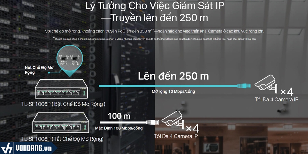 Với chế độ mở rộng, khoảng cách truyền PoE lên đến 250m—hoàn hảo cho việc triển khai Camera ở các khu vực rộng lớn.