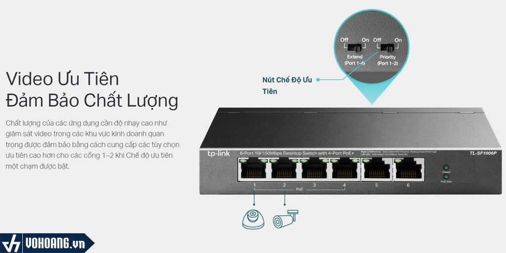 Đặc biệt Tp-Link SF1006P có chế độ ưu tiên băng thông cho 2 cổng PoE 1,2 giúp thiết bị của bạn luôn luôn trong trạng thái hoạt động tốt nhất không có độ trễ.