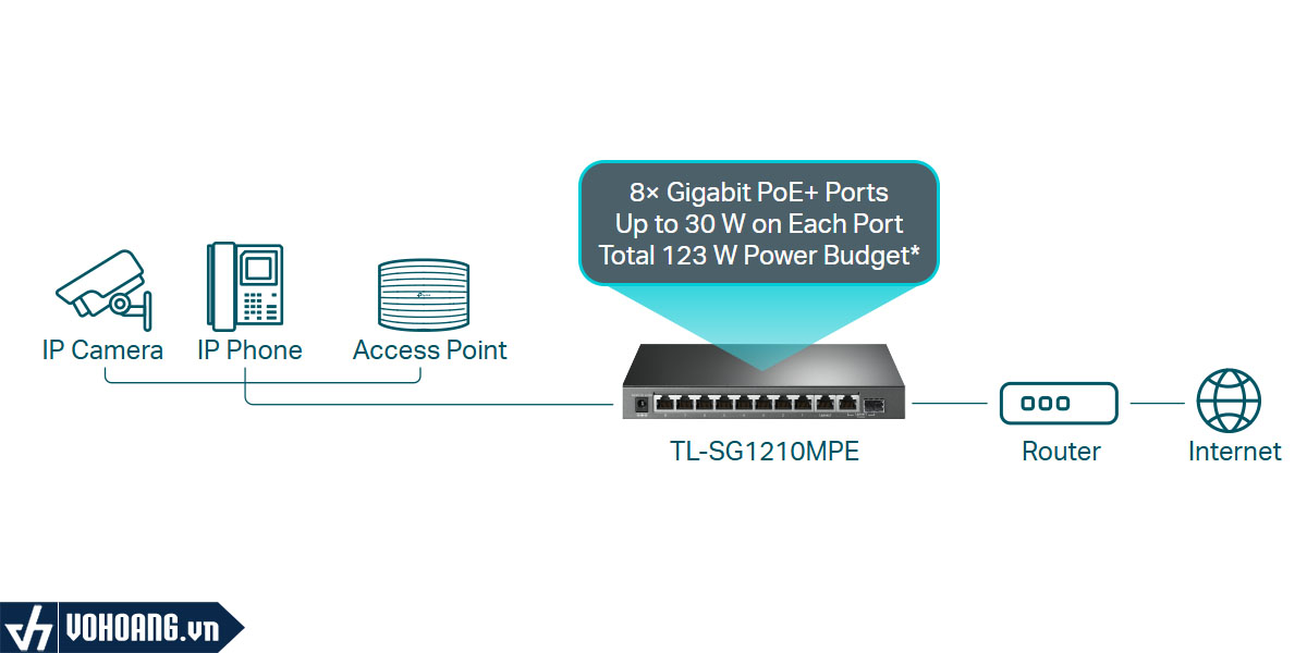 Tp-Link SG1210MPE tuân thủ tiêu chuẩn 802.3af/at PoE+ hỗ trợ cung cấp năng lượng lên đến 30W cho mỗi cổng PoE, với tổng công suất PoE là 123W cho 8 cổng PoE+ gigabit. Áp dụng nhiều lĩnh vực như giám sát an ninh, môi trường văn phòng, ký túc xá và các doanh nghiệp nhỏ.