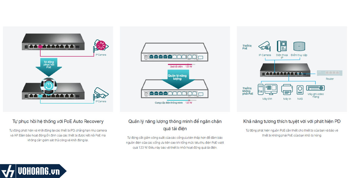 Tp-Link SG1210MPE tương thích hoàn toàn với các thiết bị PoE như camera IP, điểm truy cập và điện thoại IP. Thiết bị cũng hỗ trợ các thiết bị không PoE có dây như máy tính, máy in và IPTV.