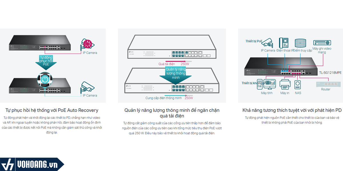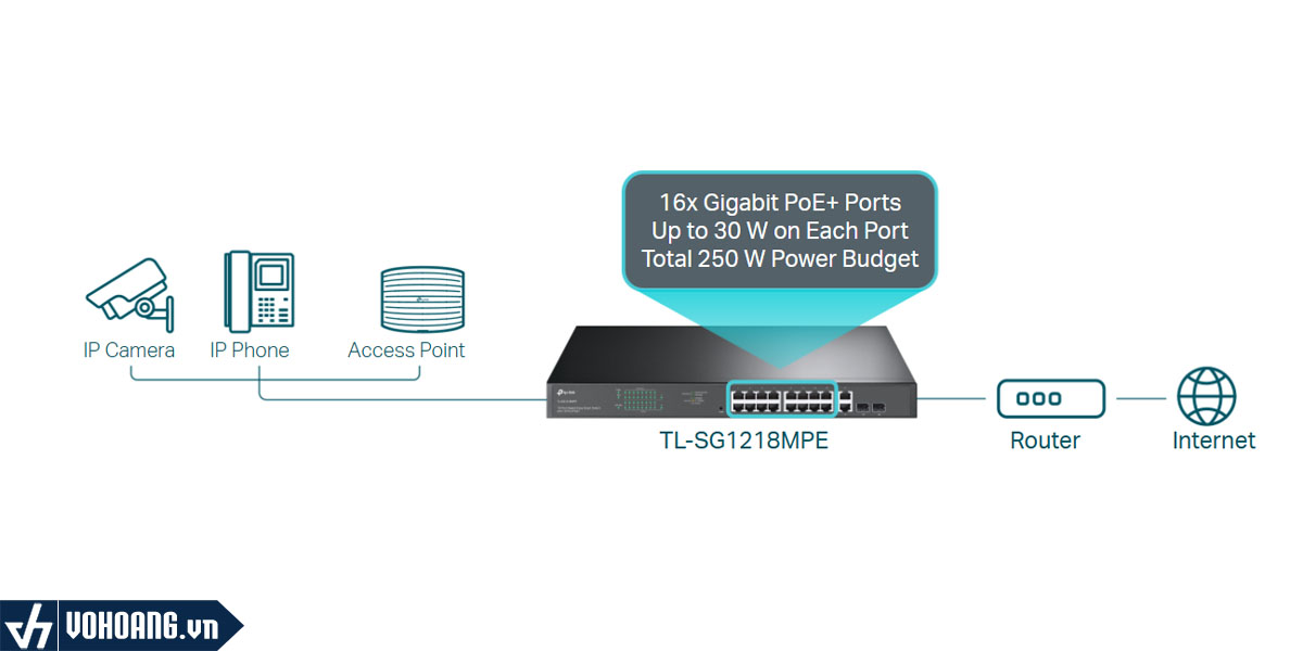 Tp-Link SG1218MPE có khả năng cung cấp đến 30 W cho mỗi cổng PoE, với tổng công suất PoE lên đến 250 W cho 16 cổng gigabit PoE+. Điều này mở ra nhiều khả năng ứng dụng trong các lĩnh vực như giám sát an ninh, môi trường văn phòng, ký túc xá và doanh nghiệp nhỏ, đồng thời đảm bảo tương thích với các thiết bị như camera IP, điểm truy cập không dây, điện thoại IP, máy tính và máy in.