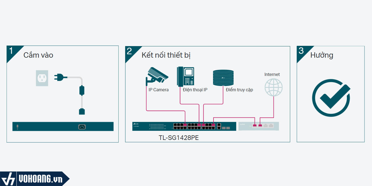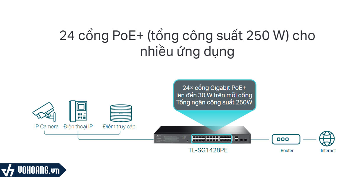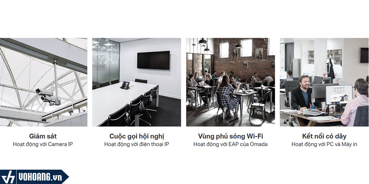 Tp-Link SG1428PE tương thích hoàn hảo với các thiết bị hỗ trợ PoE như camera IP, điểm truy cập và điện thoại IP. Ngoài ra, thiết bị này cũng cung cấp kết nối gigabit cho các thiết bị không hỗ trợ PoE như máy tính, máy in và IPTV.