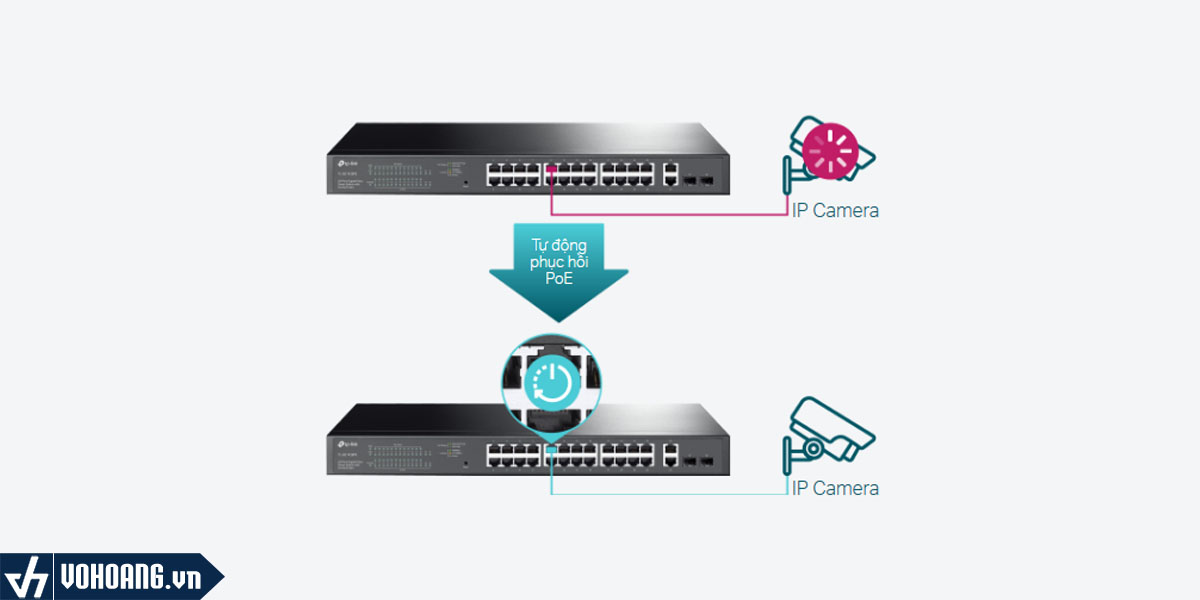 Tp-Link SG1428PE có khả năng hỗ trợ PoE, tự động nhận diện và reboot các thiết bị PD như camera và AP khi chúng không hoạt động hoặc không phản hồi. Điều này giúp đảm bảo sự ổn định của hệ thống mà không cần sự can thiệp thủ công để giám sát hay khởi động lại thiết bị.