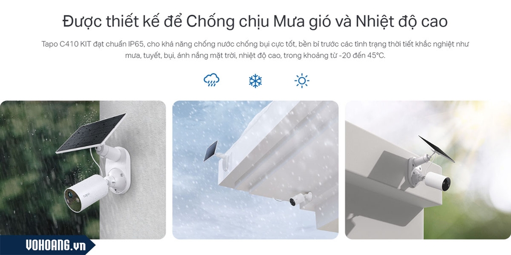 Tapo C410 KIT đạt chuẩn IP65, cho khả năng chống nước chống bụi cực tốt, bền bỉ trước các tình trạng thời tiết khắc nghiệt như mưa, tuyết, bụi, ánh nắng mặt trời, nhiệt độ cao, trong khoảng từ -20 đến 45°C.