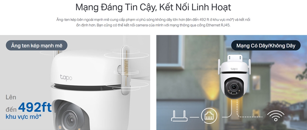 Ăng-ten kép bên ngoài mạnh mẽ cung cấp phạm vi phủ sóng không dây lớn hơn (lên đến 492 ft ở khu vực mở*) và kết nối ổn định hơn. Bạn cũng có thể kết nối camera của mình với mạng thông qua cổng Ethernet RJ45.
