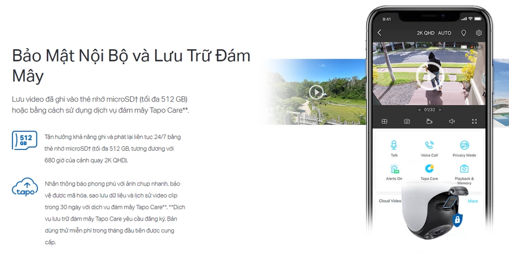 Lưu video đã ghi vào thẻ nhớ microSD† (tối đa 512 GB) hoặc bằng cách sử dụng dịch vụ đám mây Tapo Care