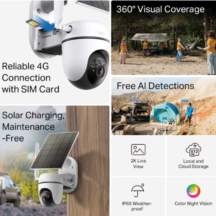 TP-Link Tapo C615G KIT là bộ camera an ninh 4G LTE quay quét năng lượng mặt trời sắp ra mắt, mang đến giải pháp giám sát linh hoạt cho những khu vực không có Wi-Fi ổn định. Với khả năng kết nối 4G qua SIM, hình ảnh 2K 3MP sắc nét, cùng AI thông minh nhận diện người, thú cưng và phương tiện, Tapo C615G KIT giúp bạn an tâm theo dõi toàn cảnh 360° mọi lúc, mọi nơi mà không lo giới hạn về nguồn điện hay đường truyền.