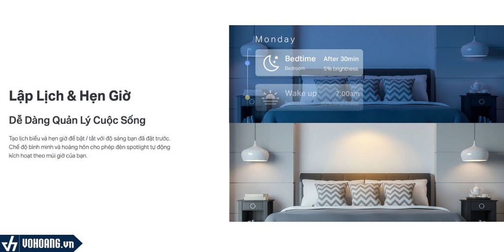 Tạo lịch biểu và hẹn giờ để bật / tắt với độ sáng bạn đã đặt trước. Chế độ bình minh và hoàng hôn cho phép đèn spotlight tự động kích hoạt theo múi giờ của bạn.