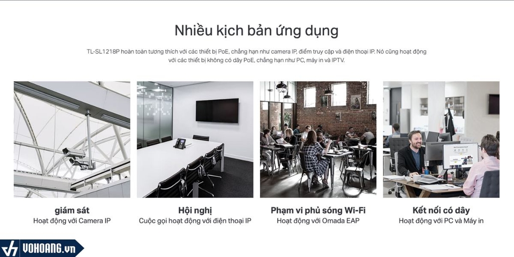 Switch TP-Link TL-SL1218P hoàn toàn tương thích với các thiết bị PoE, chẳng hạn như IP camera, điểm truy cập và IP điện thoại. Nó cũng hoạt động với các thiết bị có dây không PoE, chẳng hạn như PC, máy tính và IPTV.