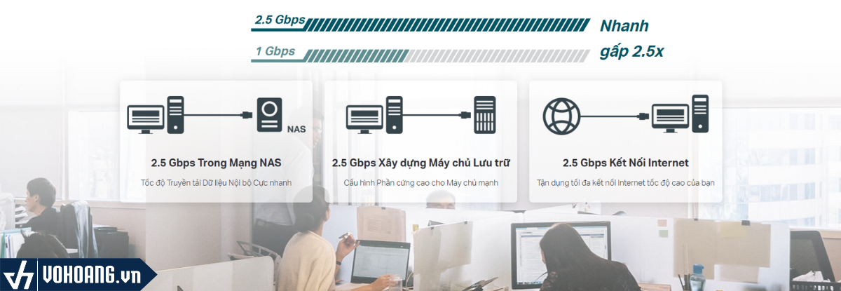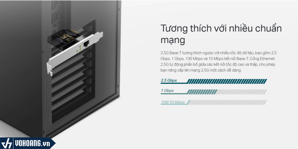 2.5G Base-T tương thích ngược với nhiều tốc độ dữ liệu, bao gồm 2.5 Gbps, 1 Gbps, 100 Mbps và 10 Mbps kết nối Base-T. Cổng Ethernet 2.5G tự động phẩn bổ giữa các kết nối tốc độ cao và thấp, cho phép bạn nâng cấp lên mạng 2.5G một cách dễ dàng.