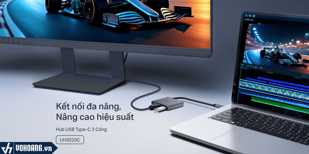 Hub USB-C 3 trong 1: UH3020C biến 1 cổng USB-C thành 3 cổng: 1x HDMI 4K@60Hz, 1x Sạc nhanh PD 100W và 1x USB-A.