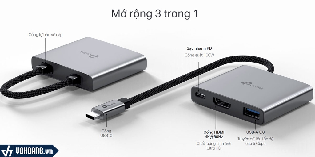 TP-Link UH3020C là hub chuyển tín hiệu từ cổng USB-C thành 3 cổng phụ bao gồm: 1 x USB-C hỗ trợ sạc nhanh 100W, 1 x HDMI 4K xuất hình ảnh sắc nét, 1 x USB-A 3.0 truyền dữ liệu cực nhanh. Với thiết kế kim loại chắc chắn TP-Link UH3020C không những bền bỉ mà còn mang vẻ bên ngoài hiện đại.