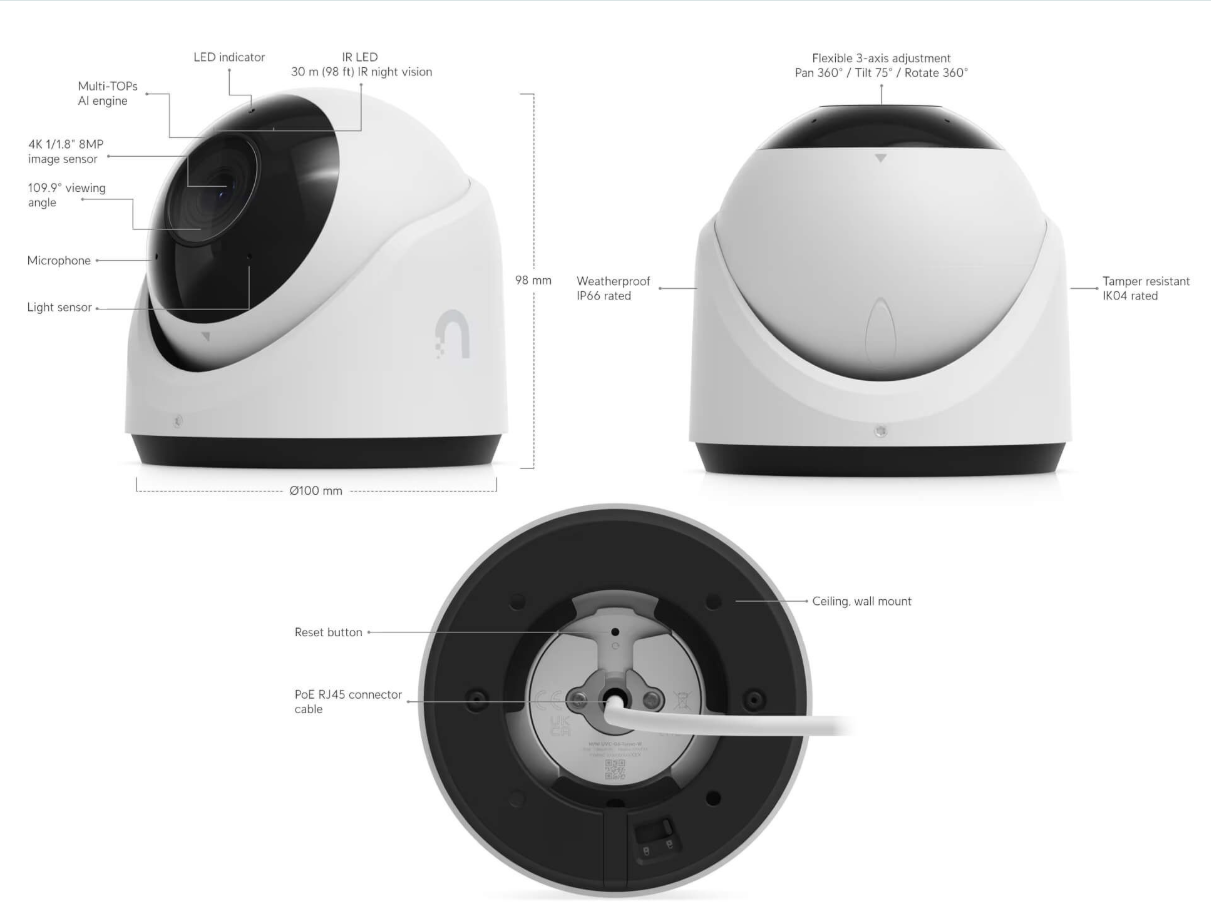 - Thiết kế cấp nguồn PoE giúp việc lắp đặt trở nên đơn giản, trong khi vỏ kim loại chắc chắn, đạt chuẩn IP66 và khả năng chiếu sáng hồng ngoại tầm xa, không gây chói đảm bảo hiệu suất đáng tin cậy ngay cả trong những môi trường ngoài trời khắc nghiệt nhất.