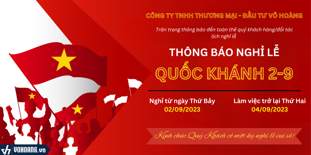 Công Ty TNHH Thương Mại - Đầu Tư Võ Hoàng xin trân trọng thông báo đến Quý Khách hàng và Quý Đối tác lịch nghỉ lễ Quốc Khánh năm 2023:
