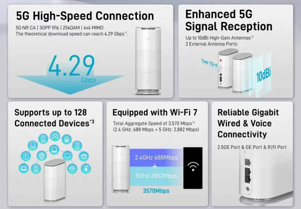 Bộ định tuyến ZTE G5 Air 5G Wi-Fi 7 là bộ định tuyến 5G thế hệ mới với Wi-Fi 7 cho tốc độ lên đến 3,6 Gbps. Thiết bị hỗ trợ 128 thiết bị, sử dụng Ăng-ten thông minh 5.0 để tăng cường tín hiệu 13 dBi và có hai cổng 2,5GE cùng một cổng điện thoại cho khả năng kết nối đa dạng tại nhà hoặc văn phòng.